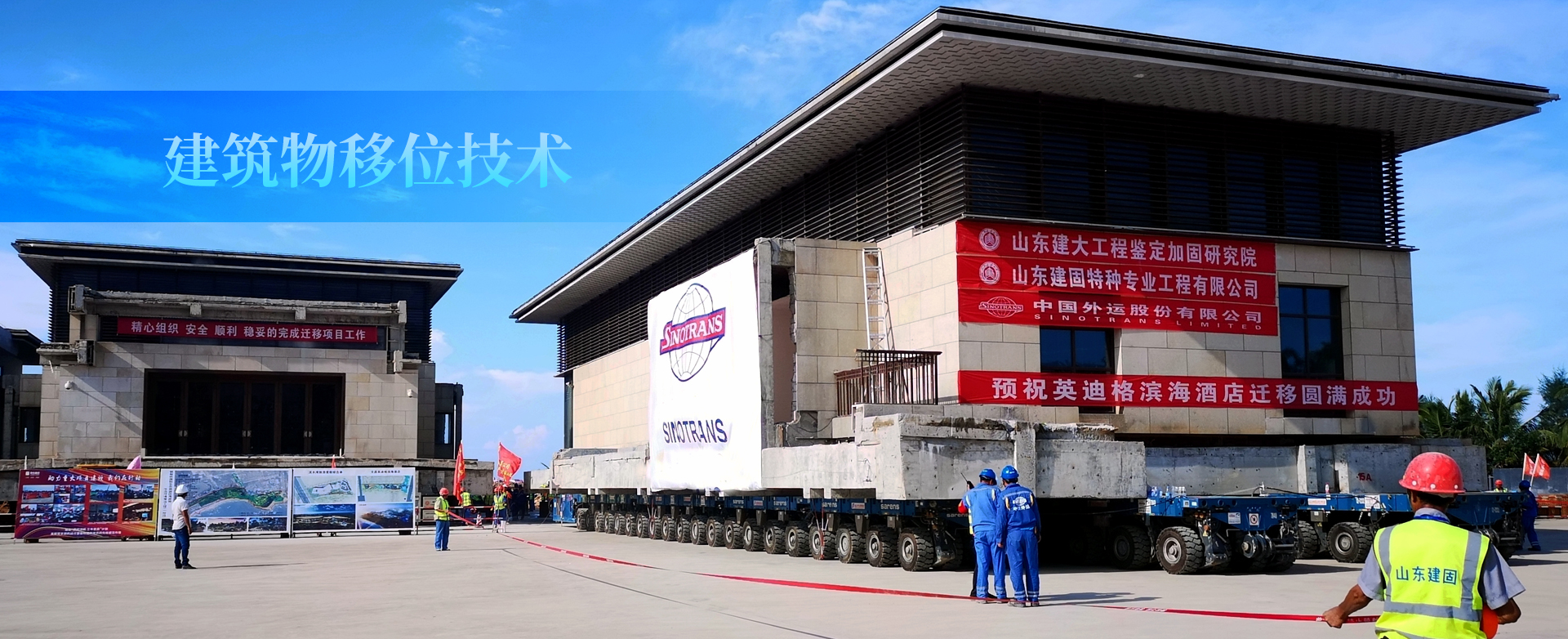 海南紅塘灣酒店為地下1層、地上2層鋼筋混凝土框架結(jié)構(gòu)。占地面積約2400㎡,總建筑面積4658㎡。遷移直線距離約500米,豎向頂升2.3米。紅塘灣酒店遷移工程的成功就位,標(biāo)志著一個新的記錄誕生:目前國內(nèi)外首例不規(guī)則扇形車輛布置、國內(nèi)拖車移位單體建筑面積最大(4658㎡)、國內(nèi)拖車移位單體建筑重量最重(7500噸)。山東建筑大學(xué)工程鑒定加固研究院、山東建固特種專業(yè)工程有限公司成立于1992年,三十年一直秉承“篤志疑難躬行求新”的企業(yè)精神,完成建筑物鑒定與加固改造、建筑移位、建筑糾傾項(xiàng)目六萬余項(xiàng)。山東萊蕪高新區(qū)辦公樓平移項(xiàng)目,建筑面積24000㎡,重量35000噸,是國內(nèi)外最重平移工程;主持完成的